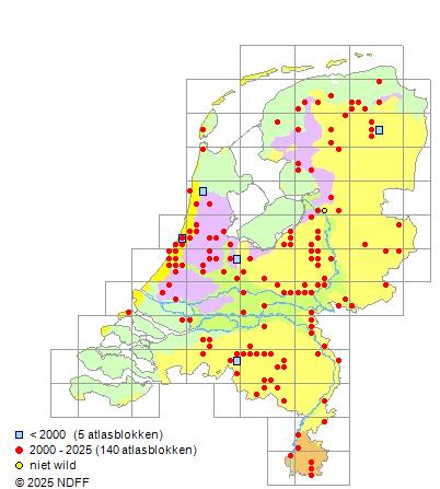 Het aantal atlasblokken (5x5 km) waarin de soort is gemeld binnen een periode van vijf jaar (vanaf 1980) of twintig jaar. Niet gecorrigeerd voor waarnemersinspanning en het aantal doorgegeven waarnemingen kan sterk variëren per periode, dus een trend in verspreiding kan hier niet direct uit worden afgelezen. Het opgegeven jaartal is het eerste jaar van de periode. Bron: gevalideerde waarnemingen uit de NDFF.