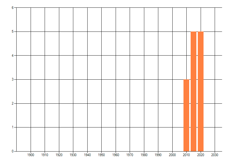 Het aantal atlasblokken (5x5 km) waarin de soort is gemeld binnen een periode van vijf jaar (vanaf 1980) of twintig jaar. Niet gecorrigeerd voor waarnemersinspanning en het aantal doorgegeven waarnemingen kan sterk variëren per periode, dus een trend in verspreiding kan hier niet direct uit worden afgelezen. Het opgegeven jaartal is het eerste jaar van de periode. Bron: gevalideerde waarnemingen uit de NDFF.