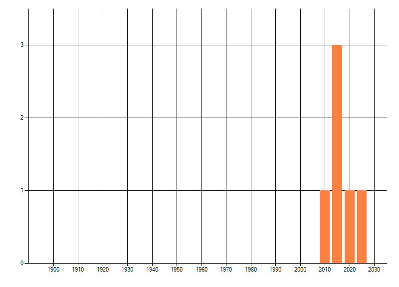 Het aantal atlasblokken (5x5 km) waarin de soort is gemeld binnen een periode van vijf jaar (vanaf 1980) of twintig jaar. Niet gecorrigeerd voor waarnemersinspanning en het aantal doorgegeven waarnemingen kan sterk variëren per periode, dus een trend in verspreiding kan hier niet direct uit worden afgelezen. Het opgegeven jaartal is het eerste jaar van de periode. Bron: gevalideerde waarnemingen uit de NDFF.