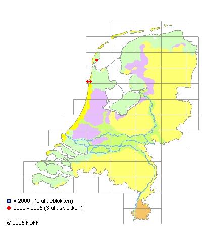 Het aantal atlasblokken (5x5 km) waarin de soort is gemeld binnen een periode van vijf jaar (vanaf 1980) of twintig jaar. Niet gecorrigeerd voor waarnemersinspanning en het aantal doorgegeven waarnemingen kan sterk variëren per periode, dus een trend in verspreiding kan hier niet direct uit worden afgelezen. Het opgegeven jaartal is het eerste jaar van de periode. Bron: gevalideerde waarnemingen uit de NDFF.