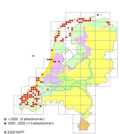 Het aantal atlasblokken (5x5 km) waarin de soort is gemeld binnen een periode van vijf jaar (vanaf 1980) of twintig jaar. Niet gecorrigeerd voor waarnemersinspanning en het aantal doorgegeven waarnemingen kan sterk variëren per periode, dus een trend in verspreiding kan hier niet direct uit worden afgelezen. Het opgegeven jaartal is het eerste jaar van de periode. Bron: gevalideerde waarnemingen uit de NDFF.