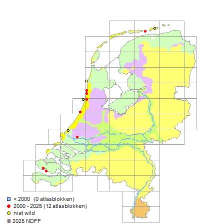 Het aantal atlasblokken (5x5 km) waarin de soort is gemeld binnen een periode van vijf jaar (vanaf 1980) of twintig jaar. Niet gecorrigeerd voor waarnemersinspanning en het aantal doorgegeven waarnemingen kan sterk variëren per periode, dus een trend in verspreiding kan hier niet direct uit worden afgelezen. Het opgegeven jaartal is het eerste jaar van de periode. Bron: gevalideerde waarnemingen uit de NDFF.