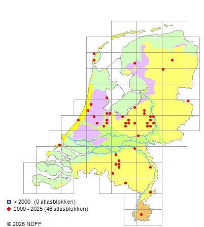 Het aantal atlasblokken (5x5 km) waarin de soort is gemeld binnen een periode van vijf jaar (vanaf 1980) of twintig jaar. Niet gecorrigeerd voor waarnemersinspanning en het aantal doorgegeven waarnemingen kan sterk variëren per periode, dus een trend in verspreiding kan hier niet direct uit worden afgelezen. Het opgegeven jaartal is het eerste jaar van de periode. Bron: gevalideerde waarnemingen uit de NDFF.