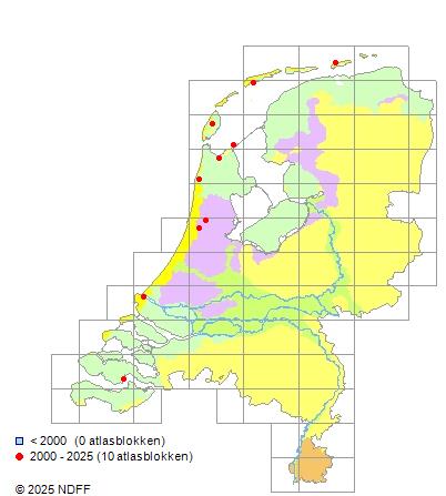 Het aantal atlasblokken (5x5 km) waarin de soort is gemeld binnen een periode van vijf jaar (vanaf 1980) of twintig jaar. Niet gecorrigeerd voor waarnemersinspanning en het aantal doorgegeven waarnemingen kan sterk variëren per periode, dus een trend in verspreiding kan hier niet direct uit worden afgelezen. Het opgegeven jaartal is het eerste jaar van de periode. Bron: gevalideerde waarnemingen uit de NDFF.