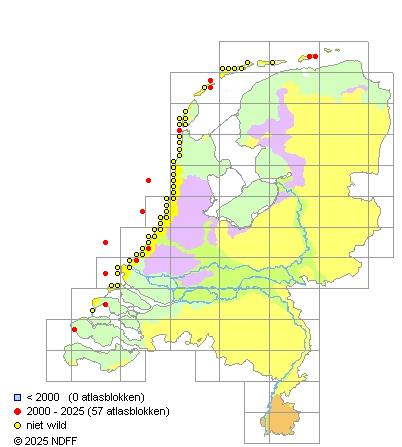 Het aantal atlasblokken (5x5 km) waarin de soort is gemeld binnen een periode van vijf jaar (vanaf 1980) of twintig jaar. Niet gecorrigeerd voor waarnemersinspanning en het aantal doorgegeven waarnemingen kan sterk variëren per periode, dus een trend in verspreiding kan hier niet direct uit worden afgelezen. Het opgegeven jaartal is het eerste jaar van de periode. Bron: gevalideerde waarnemingen uit de NDFF.