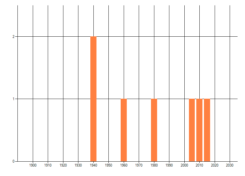 Het aantal atlasblokken (5x5 km) waarin de soort is gemeld binnen een periode van vijf jaar (vanaf 1980) of twintig jaar. Niet gecorrigeerd voor waarnemersinspanning en het aantal doorgegeven waarnemingen kan sterk variëren per periode, dus een trend in verspreiding kan hier niet direct uit worden afgelezen. Het opgegeven jaartal is het eerste jaar van de periode. Bron: gevalideerde waarnemingen uit de NDFF.
