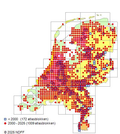 Het aantal atlasblokken (5x5 km) waarin de soort is gemeld binnen een periode van vijf jaar (vanaf 1980) of twintig jaar. Niet gecorrigeerd voor waarnemersinspanning en het aantal doorgegeven waarnemingen kan sterk variƫren per periode, dus een trend in verspreiding kan hier niet direct uit worden afgelezen. Het opgegeven jaartal is het eerste jaar van de periode. Bron: gevalideerde waarnemingen uit de NDFF.