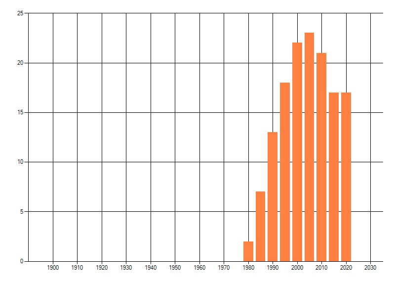 Het aantal atlasblokken (5x5 km) waarin de soort is gemeld binnen een periode van vijf jaar (vanaf 1980) of twintig jaar. Niet gecorrigeerd voor waarnemersinspanning en het aantal doorgegeven waarnemingen kan sterk variƫren per periode, dus een trend in verspreiding kan hier niet direct uit worden afgelezen. Het opgegeven jaartal is het eerste jaar van de periode. Bron: gevalideerde waarnemingen uit de NDFF.