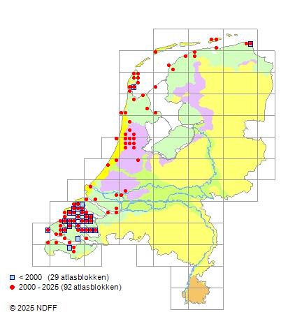Het aantal atlasblokken (5x5 km) waarin de soort is gemeld binnen een periode van vijf jaar (vanaf 1980) of twintig jaar. Niet gecorrigeerd voor waarnemersinspanning en het aantal doorgegeven waarnemingen kan sterk variƫren per periode, dus een trend in verspreiding kan hier niet direct uit worden afgelezen. Het opgegeven jaartal is het eerste jaar van de periode. Bron: gevalideerde waarnemingen uit de NDFF.