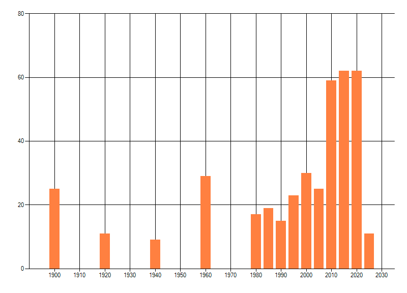 Het aantal atlasblokken (5x5 km) waarin de soort is gemeld binnen een periode van vijf jaar (vanaf 1980) of twintig jaar. Niet gecorrigeerd voor waarnemersinspanning en het aantal doorgegeven waarnemingen kan sterk variëren per periode, dus een trend in verspreiding kan hier niet direct uit worden afgelezen. Het opgegeven jaartal is het eerste jaar van de periode. Bron: gevalideerde waarnemingen uit de NDFF.