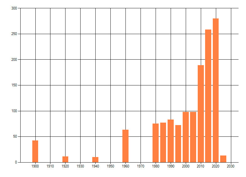Het aantal atlasblokken (5x5 km) waarin de soort is gemeld binnen een periode van vijf jaar (vanaf 1980) of twintig jaar. Niet gecorrigeerd voor waarnemersinspanning en het aantal doorgegeven waarnemingen kan sterk variëren per periode, dus een trend in verspreiding kan hier niet direct uit worden afgelezen. Het opgegeven jaartal is het eerste jaar van de periode. Bron: gevalideerde waarnemingen uit de NDFF.