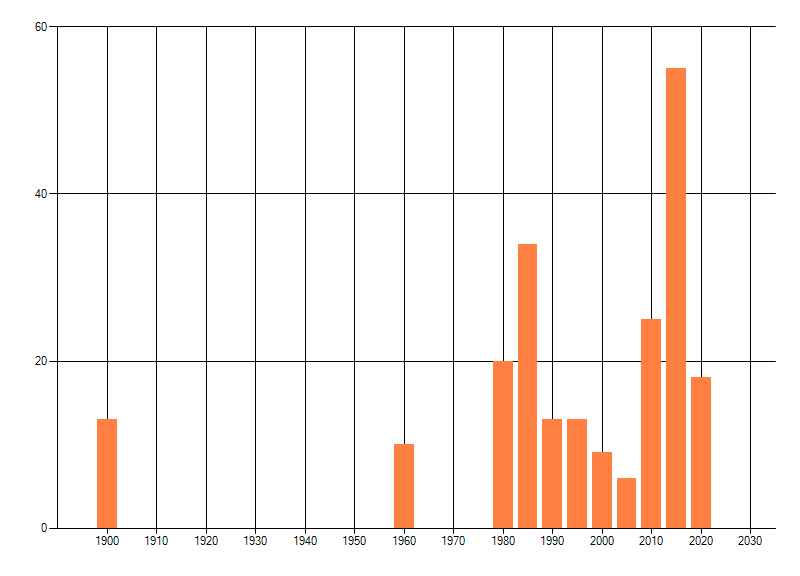 Het aantal atlasblokken (5x5 km) waarin de soort is gemeld binnen een periode van vijf jaar (vanaf 1980) of twintig jaar. Niet gecorrigeerd voor waarnemersinspanning en het aantal doorgegeven waarnemingen kan sterk variëren per periode, dus een trend in verspreiding kan hier niet direct uit worden afgelezen. Het opgegeven jaartal is het eerste jaar van de periode. Bron: gevalideerde waarnemingen uit de NDFF.