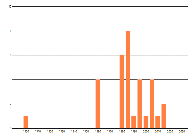 Het aantal atlasblokken (5x5 km) waarin de soort is gemeld binnen een periode van vijf jaar (vanaf 1980) of twintig jaar. Niet gecorrigeerd voor waarnemersinspanning en het aantal doorgegeven waarnemingen kan sterk variëren per periode, dus een trend in verspreiding kan hier niet direct uit worden afgelezen. Het opgegeven jaartal is het eerste jaar van de periode. Bron: gevalideerde waarnemingen uit de NDFF.