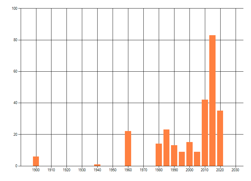 Het aantal atlasblokken (5x5 km) waarin de soort is gemeld binnen een periode van vijf jaar (vanaf 1980) of twintig jaar. Niet gecorrigeerd voor waarnemersinspanning en het aantal doorgegeven waarnemingen kan sterk variëren per periode, dus een trend in verspreiding kan hier niet direct uit worden afgelezen. Het opgegeven jaartal is het eerste jaar van de periode. Bron: gevalideerde waarnemingen uit de NDFF.