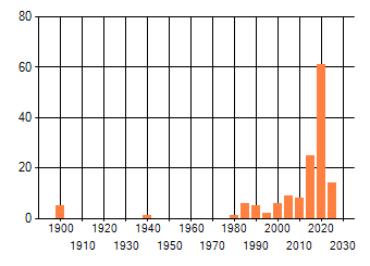 Het aantal atlasblokken (5x5 km) waarin de soort is gemeld binnen een periode van vijf jaar (vanaf 1980) of twintig jaar. Niet gecorrigeerd voor waarnemersinspanning en het aantal doorgegeven waarnemingen kan sterk variëren per periode, dus een trend in verspreiding kan hier niet direct uit worden afgelezen. Het opgegeven jaartal is het eerste jaar van de periode. Bron: gevalideerde waarnemingen uit de NDFF.