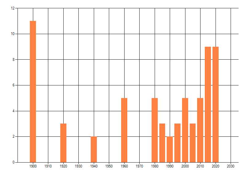 Het aantal atlasblokken (5x5 km) waarin de soort is gemeld binnen een periode van vijf jaar (vanaf 1980) of twintig jaar. Niet gecorrigeerd voor waarnemersinspanning en het aantal doorgegeven waarnemingen kan sterk variëren per periode, dus een trend in verspreiding kan hier niet direct uit worden afgelezen. Het opgegeven jaartal is het eerste jaar van de periode. Bron: gevalideerde waarnemingen uit de NDFF.