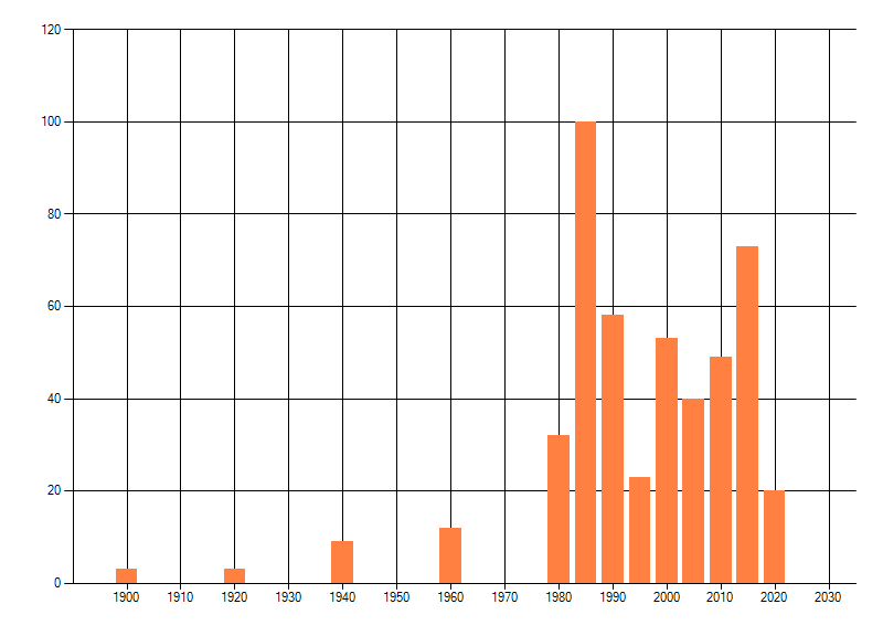 Het aantal atlasblokken (5x5 km) waarin de soort is gemeld binnen een periode van vijf jaar (vanaf 1980) of twintig jaar. Niet gecorrigeerd voor waarnemersinspanning en het aantal doorgegeven waarnemingen kan sterk variëren per periode, dus een trend in verspreiding kan hier niet direct uit worden afgelezen. Het opgegeven jaartal is het eerste jaar van de periode. Bron: gevalideerde waarnemingen uit de NDFF.