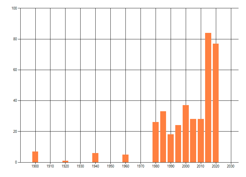 Het aantal atlasblokken (5x5 km) waarin de soort is gemeld binnen een periode van vijf jaar (vanaf 1980) of twintig jaar. Niet gecorrigeerd voor waarnemersinspanning en het aantal doorgegeven waarnemingen kan sterk variëren per periode, dus een trend in verspreiding kan hier niet direct uit worden afgelezen. Het opgegeven jaartal is het eerste jaar van de periode. Bron: gevalideerde waarnemingen uit de NDFF.