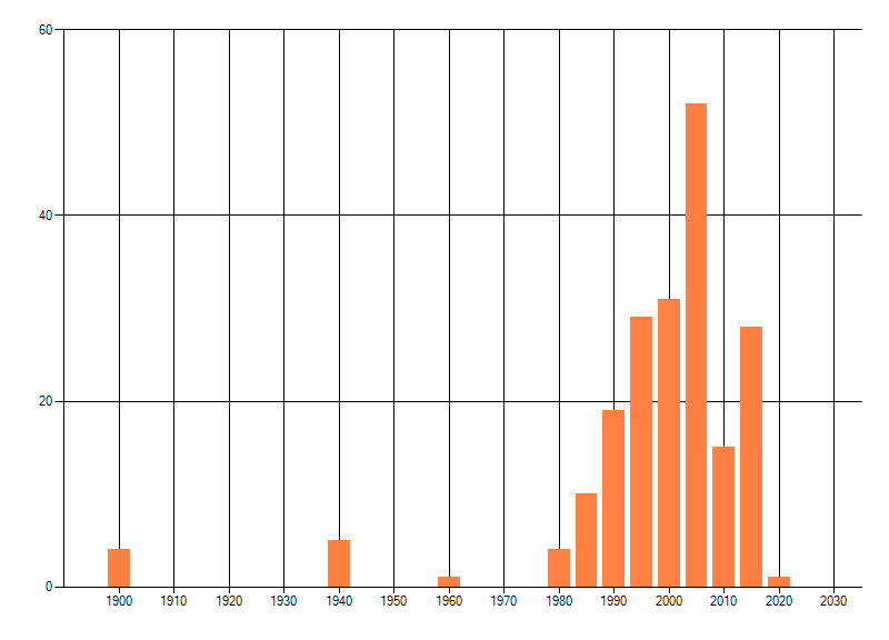 Het aantal atlasblokken (5x5 km) waarin de soort is gemeld binnen een periode van vijf jaar (vanaf 1980) of twintig jaar. Niet gecorrigeerd voor waarnemersinspanning en het aantal doorgegeven waarnemingen kan sterk variëren per periode, dus een trend in verspreiding kan hier niet direct uit worden afgelezen. Het opgegeven jaartal is het eerste jaar van de periode. Bron: gevalideerde waarnemingen uit de NDFF.