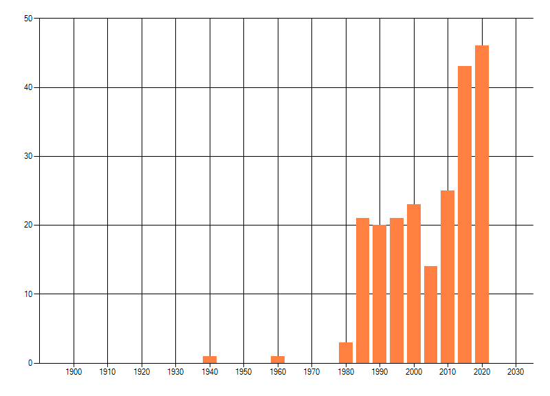 Het aantal atlasblokken (5x5 km) waarin de soort is gemeld binnen een periode van vijf jaar (vanaf 1980) of twintig jaar. Niet gecorrigeerd voor waarnemersinspanning en het aantal doorgegeven waarnemingen kan sterk variëren per periode, dus een trend in verspreiding kan hier niet direct uit worden afgelezen. Het opgegeven jaartal is het eerste jaar van de periode. Bron: gevalideerde waarnemingen uit de NDFF.