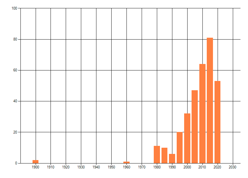 Het aantal atlasblokken (5x5 km) waarin de soort is gemeld binnen een periode van vijf jaar (vanaf 1980) of twintig jaar. Niet gecorrigeerd voor waarnemersinspanning en het aantal doorgegeven waarnemingen kan sterk variëren per periode, dus een trend in verspreiding kan hier niet direct uit worden afgelezen. Het opgegeven jaartal is het eerste jaar van de periode. Bron: gevalideerde waarnemingen uit de NDFF.