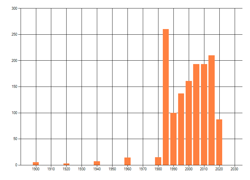 Het aantal atlasblokken (5x5 km) waarin de soort is gemeld binnen een periode van vijf jaar (vanaf 1980) of twintig jaar. Niet gecorrigeerd voor waarnemersinspanning en het aantal doorgegeven waarnemingen kan sterk variëren per periode, dus een trend in verspreiding kan hier niet direct uit worden afgelezen. Het opgegeven jaartal is het eerste jaar van de periode. Bron: gevalideerde waarnemingen uit de NDFF.