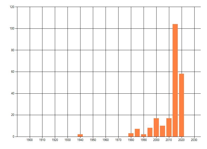 Het aantal atlasblokken (5x5 km) waarin de soort is gemeld binnen een periode van vijf jaar (vanaf 1980) of twintig jaar. Niet gecorrigeerd voor waarnemersinspanning en het aantal doorgegeven waarnemingen kan sterk variëren per periode, dus een trend in verspreiding kan hier niet direct uit worden afgelezen. Het opgegeven jaartal is het eerste jaar van de periode. Bron: gevalideerde waarnemingen uit de NDFF.