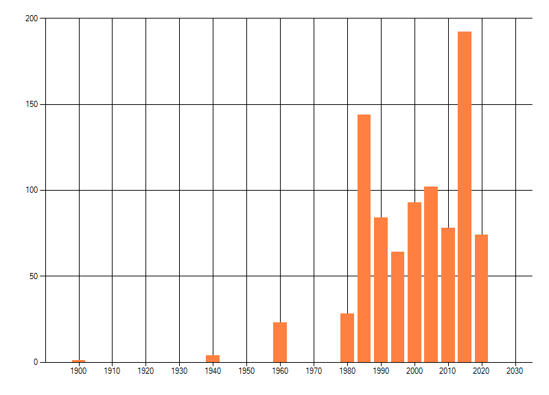 Het aantal atlasblokken (5x5 km) waarin de soort is gemeld binnen een periode van vijf jaar (vanaf 1980) of twintig jaar. Niet gecorrigeerd voor waarnemersinspanning en het aantal doorgegeven waarnemingen kan sterk variëren per periode, dus een trend in verspreiding kan hier niet direct uit worden afgelezen. Het opgegeven jaartal is het eerste jaar van de periode. Bron: gevalideerde waarnemingen uit de NDFF.