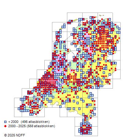 Het aantal atlasblokken (5x5 km) waarin de soort is gemeld binnen een periode van vijf jaar (vanaf 1980) of twintig jaar. Niet gecorrigeerd voor waarnemersinspanning en het aantal doorgegeven waarnemingen kan sterk variëren per periode, dus een trend in verspreiding kan hier niet direct uit worden afgelezen. Het opgegeven jaartal is het eerste jaar van de periode. Bron: gevalideerde waarnemingen uit de NDFF.