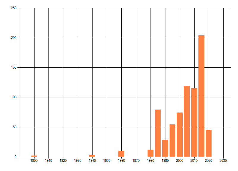 Het aantal atlasblokken (5x5 km) waarin de soort is gemeld binnen een periode van vijf jaar (vanaf 1980) of twintig jaar. Niet gecorrigeerd voor waarnemersinspanning en het aantal doorgegeven waarnemingen kan sterk variëren per periode, dus een trend in verspreiding kan hier niet direct uit worden afgelezen. Het opgegeven jaartal is het eerste jaar van de periode. Bron: gevalideerde waarnemingen uit de NDFF.
