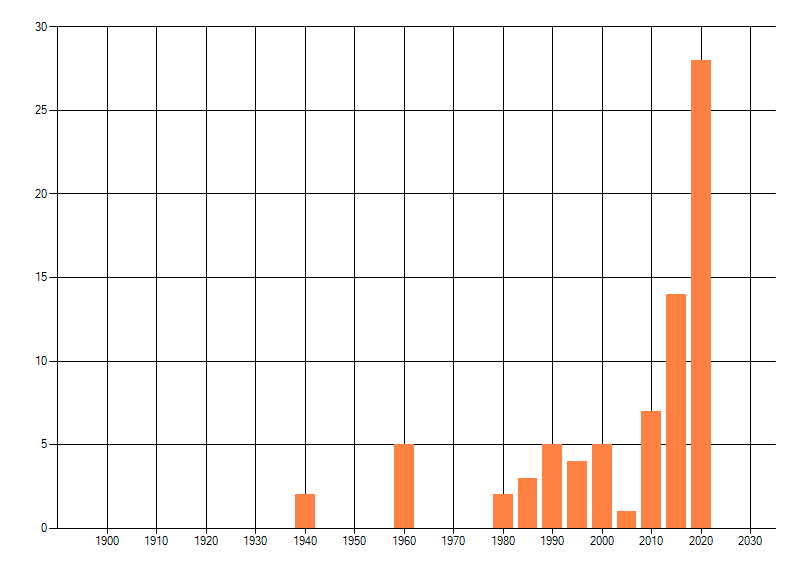 Het aantal atlasblokken (5x5 km) waarin de soort is gemeld binnen een periode van vijf jaar (vanaf 1980) of twintig jaar. Niet gecorrigeerd voor waarnemersinspanning en het aantal doorgegeven waarnemingen kan sterk variëren per periode, dus een trend in verspreiding kan hier niet direct uit worden afgelezen. Het opgegeven jaartal is het eerste jaar van de periode. Bron: gevalideerde waarnemingen uit de NDFF.