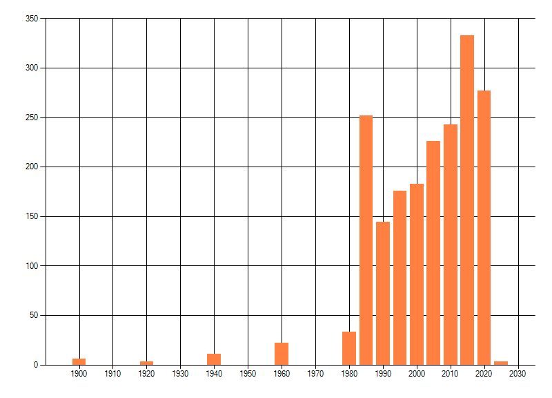 Het aantal atlasblokken (5x5 km) waarin de soort is gemeld binnen een periode van vijf jaar (vanaf 1980) of twintig jaar. Niet gecorrigeerd voor waarnemersinspanning en het aantal doorgegeven waarnemingen kan sterk variëren per periode, dus een trend in verspreiding kan hier niet direct uit worden afgelezen. Het opgegeven jaartal is het eerste jaar van de periode. Bron: gevalideerde waarnemingen uit de NDFF.