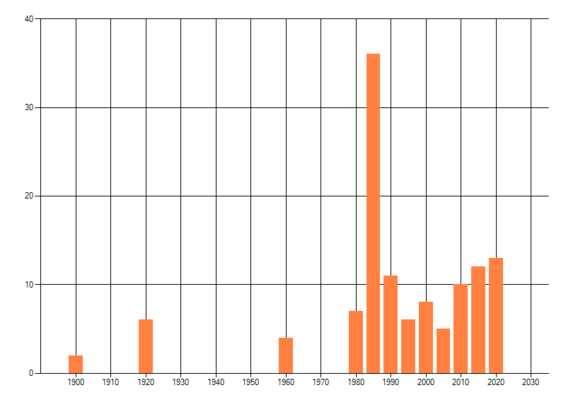 Het aantal atlasblokken (5x5 km) waarin de soort is gemeld binnen een periode van vijf jaar (vanaf 1980) of twintig jaar. Niet gecorrigeerd voor waarnemersinspanning en het aantal doorgegeven waarnemingen kan sterk variëren per periode, dus een trend in verspreiding kan hier niet direct uit worden afgelezen. Het opgegeven jaartal is het eerste jaar van de periode. Bron: gevalideerde waarnemingen uit de NDFF.