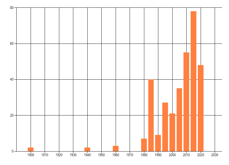 Het aantal atlasblokken (5x5 km) waarin de soort is gemeld binnen een periode van vijf jaar (vanaf 1980) of twintig jaar. Niet gecorrigeerd voor waarnemersinspanning en het aantal doorgegeven waarnemingen kan sterk variëren per periode, dus een trend in verspreiding kan hier niet direct uit worden afgelezen. Het opgegeven jaartal is het eerste jaar van de periode. Bron: gevalideerde waarnemingen uit de NDFF.