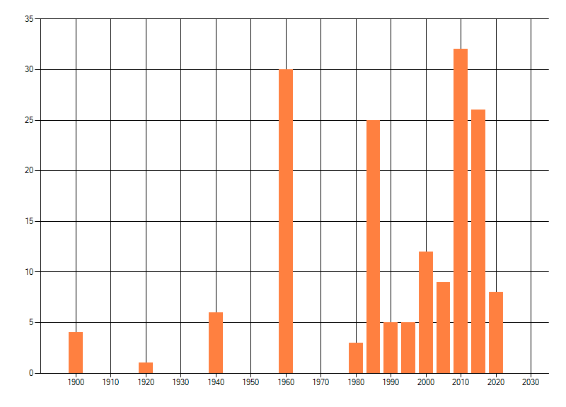 Het aantal atlasblokken (5x5 km) waarin de soort is gemeld binnen een periode van vijf jaar (vanaf 1980) of twintig jaar. Niet gecorrigeerd voor waarnemersinspanning en het aantal doorgegeven waarnemingen kan sterk variëren per periode, dus een trend in verspreiding kan hier niet direct uit worden afgelezen. Het opgegeven jaartal is het eerste jaar van de periode. Bron: gevalideerde waarnemingen uit de NDFF.