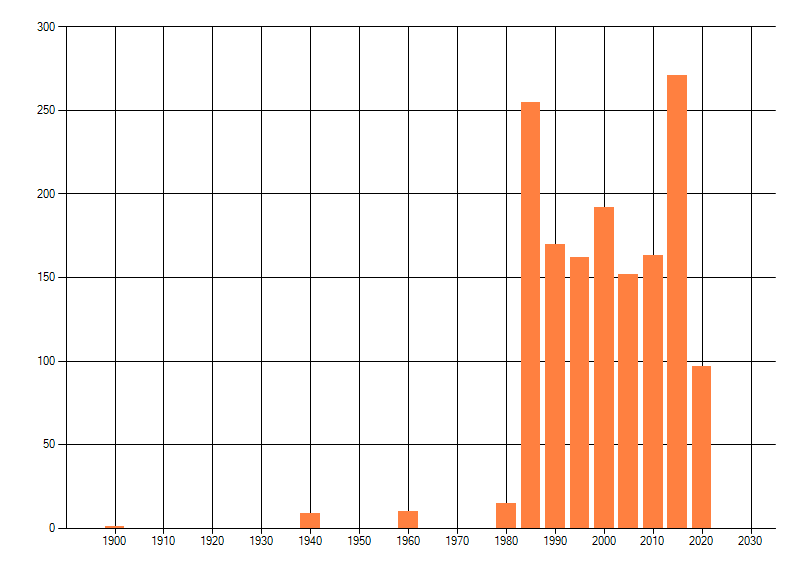 Het aantal atlasblokken (5x5 km) waarin de soort is gemeld binnen een periode van vijf jaar (vanaf 1980) of twintig jaar. Niet gecorrigeerd voor waarnemersinspanning en het aantal doorgegeven waarnemingen kan sterk variëren per periode, dus een trend in verspreiding kan hier niet direct uit worden afgelezen. Het opgegeven jaartal is het eerste jaar van de periode. Bron: gevalideerde waarnemingen uit de NDFF.