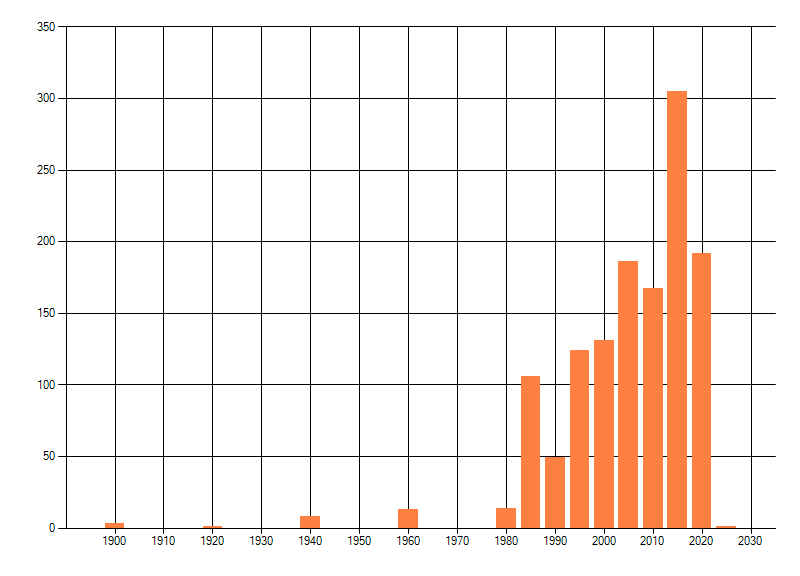 Het aantal atlasblokken (5x5 km) waarin de soort is gemeld binnen een periode van vijf jaar (vanaf 1980) of twintig jaar. Niet gecorrigeerd voor waarnemersinspanning en het aantal doorgegeven waarnemingen kan sterk variëren per periode, dus een trend in verspreiding kan hier niet direct uit worden afgelezen. Het opgegeven jaartal is het eerste jaar van de periode. Bron: gevalideerde waarnemingen uit de NDFF.