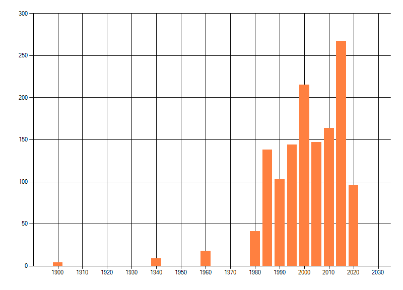 Het aantal atlasblokken (5x5 km) waarin de soort is gemeld binnen een periode van vijf jaar (vanaf 1980) of twintig jaar. Niet gecorrigeerd voor waarnemersinspanning en het aantal doorgegeven waarnemingen kan sterk variëren per periode, dus een trend in verspreiding kan hier niet direct uit worden afgelezen. Het opgegeven jaartal is het eerste jaar van de periode. Bron: gevalideerde waarnemingen uit de NDFF.