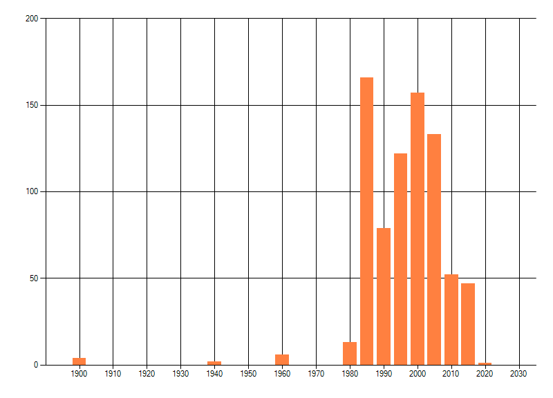 Het aantal atlasblokken (5x5 km) waarin de soort is gemeld binnen een periode van vijf jaar (vanaf 1980) of twintig jaar. Niet gecorrigeerd voor waarnemersinspanning en het aantal doorgegeven waarnemingen kan sterk variëren per periode, dus een trend in verspreiding kan hier niet direct uit worden afgelezen. Het opgegeven jaartal is het eerste jaar van de periode. Bron: gevalideerde waarnemingen uit de NDFF.