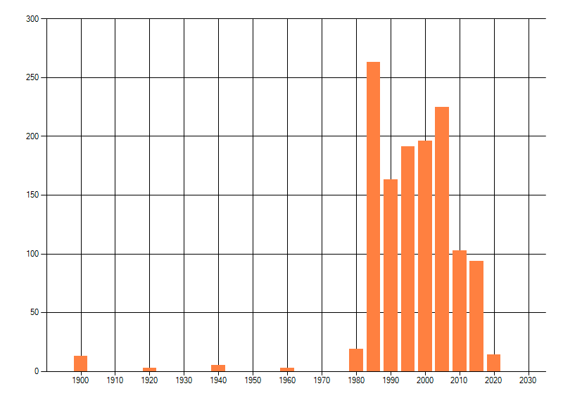 Het aantal atlasblokken (5x5 km) waarin de soort is gemeld binnen een periode van vijf jaar (vanaf 1980) of twintig jaar. Niet gecorrigeerd voor waarnemersinspanning en het aantal doorgegeven waarnemingen kan sterk variëren per periode, dus een trend in verspreiding kan hier niet direct uit worden afgelezen. Het opgegeven jaartal is het eerste jaar van de periode. Bron: gevalideerde waarnemingen uit de NDFF.