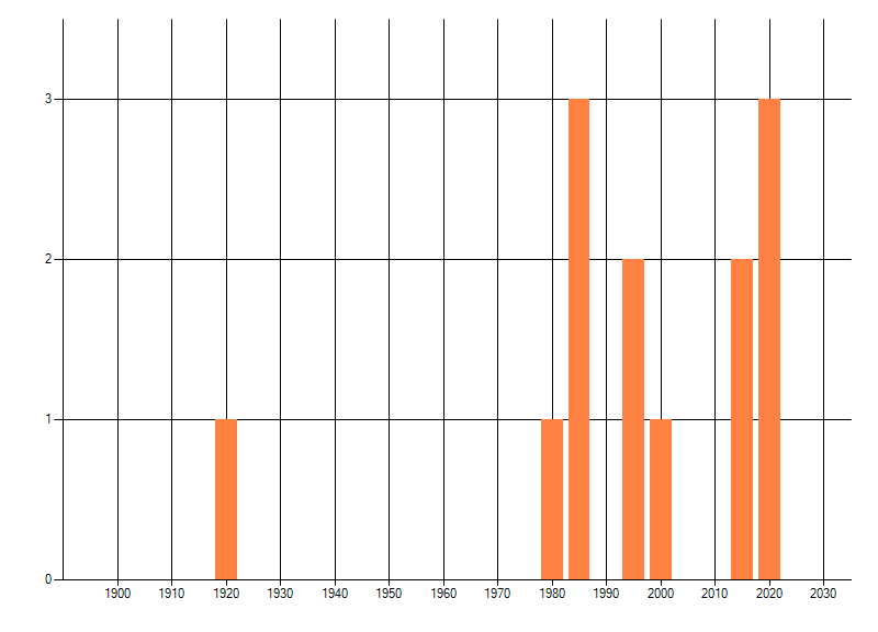 Het aantal atlasblokken (5x5 km) waarin de soort is gemeld binnen een periode van vijf jaar (vanaf 1980) of twintig jaar. Niet gecorrigeerd voor waarnemersinspanning en het aantal doorgegeven waarnemingen kan sterk variëren per periode, dus een trend in verspreiding kan hier niet direct uit worden afgelezen. Het opgegeven jaartal is het eerste jaar van de periode. Bron: gevalideerde waarnemingen uit de NDFF.