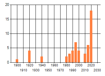 Het aantal atlasblokken (5x5 km) waarin de soort is gemeld binnen een periode van vijf jaar (vanaf 1980) of twintig jaar. Niet gecorrigeerd voor waarnemersinspanning en het aantal doorgegeven waarnemingen kan sterk variëren per periode, dus een trend in verspreiding kan hier niet direct uit worden afgelezen. Het opgegeven jaartal is het eerste jaar van de periode. Bron: gevalideerde waarnemingen uit de NDFF.