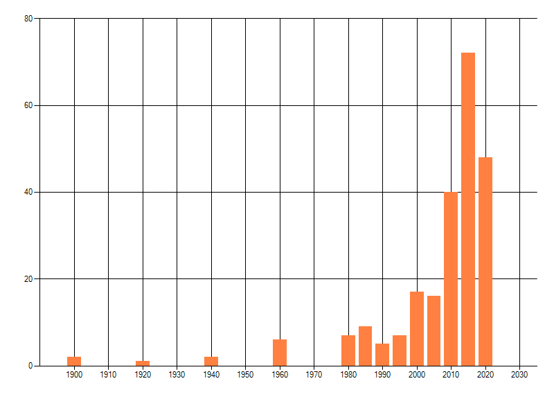 Het aantal atlasblokken (5x5 km) waarin de soort is gemeld binnen een periode van vijf jaar (vanaf 1980) of twintig jaar. Niet gecorrigeerd voor waarnemersinspanning en het aantal doorgegeven waarnemingen kan sterk variëren per periode, dus een trend in verspreiding kan hier niet direct uit worden afgelezen. Het opgegeven jaartal is het eerste jaar van de periode. Bron: gevalideerde waarnemingen uit de NDFF.