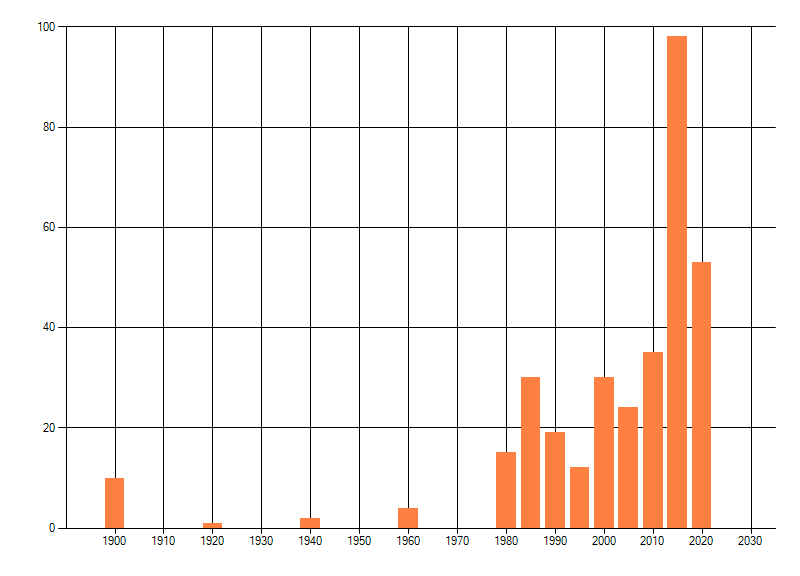 Het aantal atlasblokken (5x5 km) waarin de soort is gemeld binnen een periode van vijf jaar (vanaf 1980) of twintig jaar. Niet gecorrigeerd voor waarnemersinspanning en het aantal doorgegeven waarnemingen kan sterk variëren per periode, dus een trend in verspreiding kan hier niet direct uit worden afgelezen. Het opgegeven jaartal is het eerste jaar van de periode. Bron: gevalideerde waarnemingen uit de NDFF.