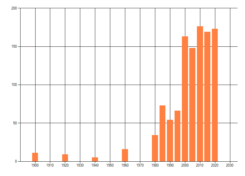 Het aantal atlasblokken (5x5 km) waarin de soort is gemeld binnen een periode van vijf jaar (vanaf 1980) of twintig jaar. Niet gecorrigeerd voor waarnemersinspanning en het aantal doorgegeven waarnemingen kan sterk variëren per periode, dus een trend in verspreiding kan hier niet direct uit worden afgelezen. Het opgegeven jaartal is het eerste jaar van de periode. Bron: gevalideerde waarnemingen uit de NDFF.