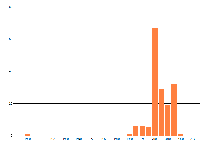 Het aantal atlasblokken (5x5 km) waarin de soort is gemeld binnen een periode van vijf jaar (vanaf 1980) of twintig jaar. Niet gecorrigeerd voor waarnemersinspanning en het aantal doorgegeven waarnemingen kan sterk variëren per periode, dus een trend in verspreiding kan hier niet direct uit worden afgelezen. Het opgegeven jaartal is het eerste jaar van de periode. Bron: gevalideerde waarnemingen uit de NDFF.