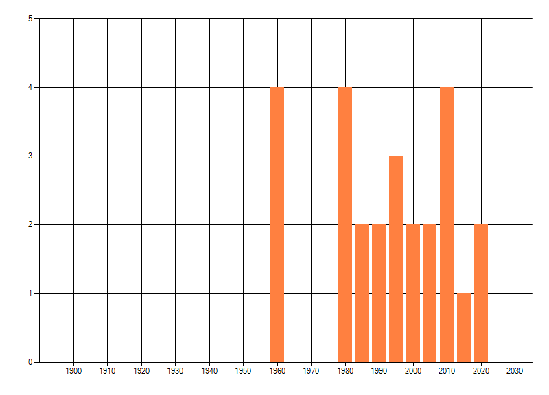 Het aantal atlasblokken (5x5 km) waarin de soort is gemeld binnen een periode van vijf jaar (vanaf 1980) of twintig jaar. Niet gecorrigeerd voor waarnemersinspanning en het aantal doorgegeven waarnemingen kan sterk variëren per periode, dus een trend in verspreiding kan hier niet direct uit worden afgelezen. Het opgegeven jaartal is het eerste jaar van de periode. Bron: gevalideerde waarnemingen uit de NDFF.