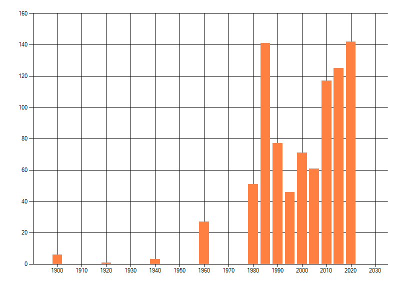 Het aantal atlasblokken (5x5 km) waarin de soort is gemeld binnen een periode van vijf jaar (vanaf 1980) of twintig jaar. Niet gecorrigeerd voor waarnemersinspanning en het aantal doorgegeven waarnemingen kan sterk variëren per periode, dus een trend in verspreiding kan hier niet direct uit worden afgelezen. Het opgegeven jaartal is het eerste jaar van de periode. Bron: gevalideerde waarnemingen uit de NDFF.