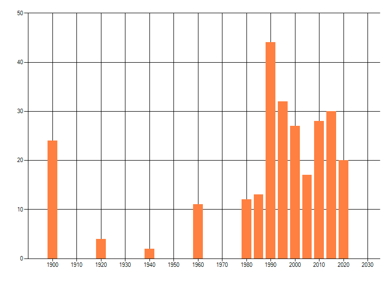 Het aantal atlasblokken (5x5 km) waarin de soort is gemeld binnen een periode van vijf jaar (vanaf 1980) of twintig jaar. Niet gecorrigeerd voor waarnemersinspanning en het aantal doorgegeven waarnemingen kan sterk variëren per periode, dus een trend in verspreiding kan hier niet direct uit worden afgelezen. Het opgegeven jaartal is het eerste jaar van de periode. Bron: gevalideerde waarnemingen uit de NDFF.