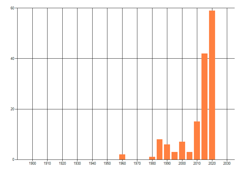 Het aantal atlasblokken (5x5 km) waarin de soort is gemeld binnen een periode van vijf jaar (vanaf 1980) of twintig jaar. Niet gecorrigeerd voor waarnemersinspanning en het aantal doorgegeven waarnemingen kan sterk variëren per periode, dus een trend in verspreiding kan hier niet direct uit worden afgelezen. Het opgegeven jaartal is het eerste jaar van de periode. Bron: gevalideerde waarnemingen uit de NDFF.
